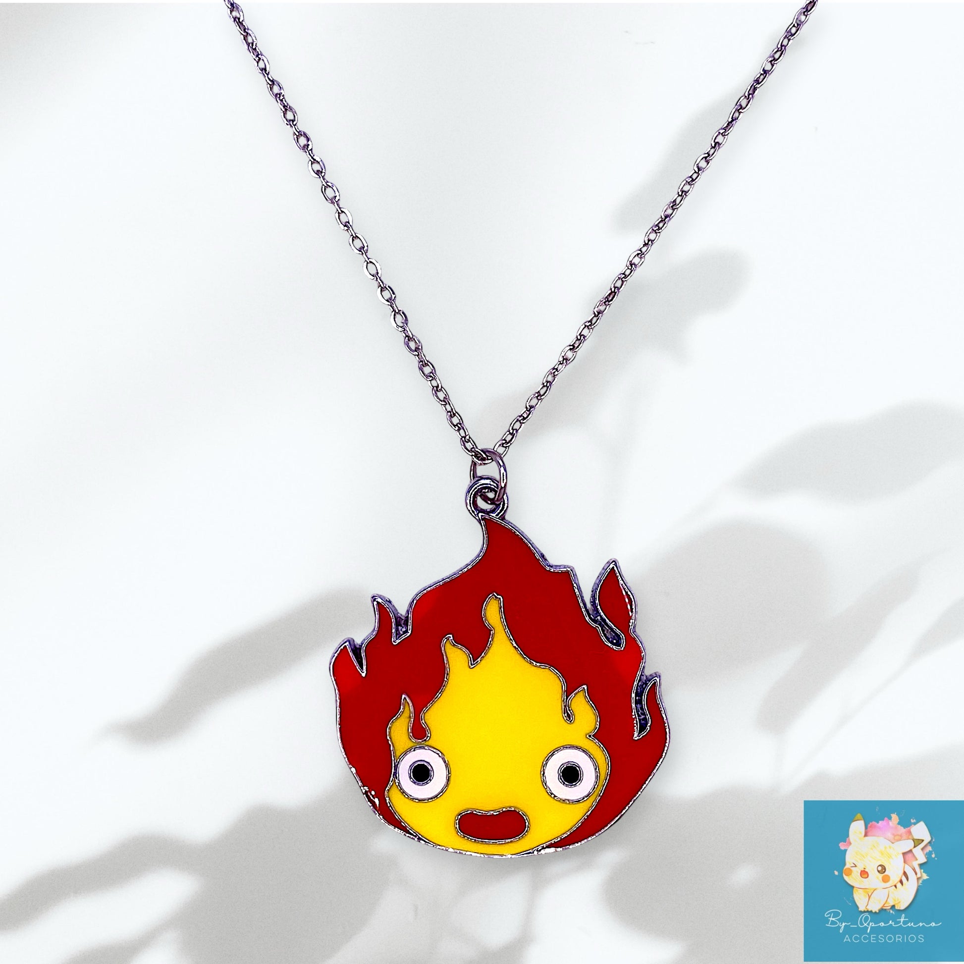 Cadena de acero inoxidable de 50 cm con dije esmaltado (de fantasía) de 2.5 a 3.5 cm inspirado en Calcifer, la llamita más intensa y adorable del cine.