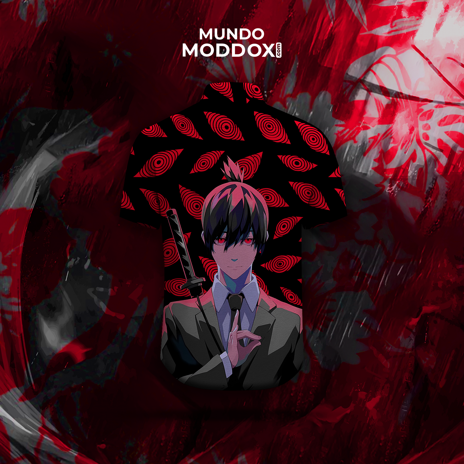 Hipnosis visual + elegancia letal 👁️👁️ Patrón de ojos en rojo y retrato del cazador Aki con katana. Cuidado en cada costura, caída cómoda y presencia que corta el aire. Lista para la misión 🗡️