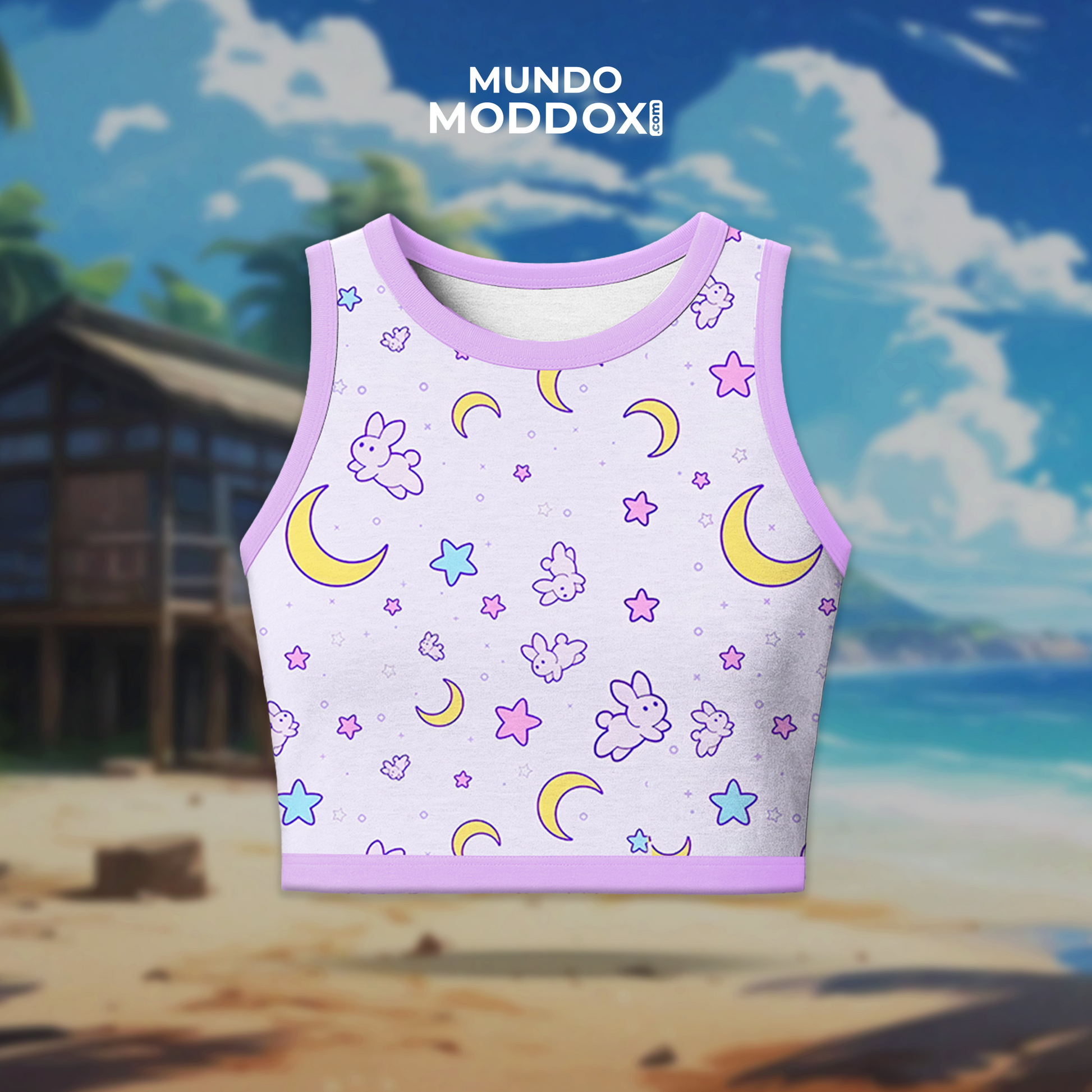 Este crop top kawaii mezcla conejitos, estrellas y lunas para un look dulce y soñador.
