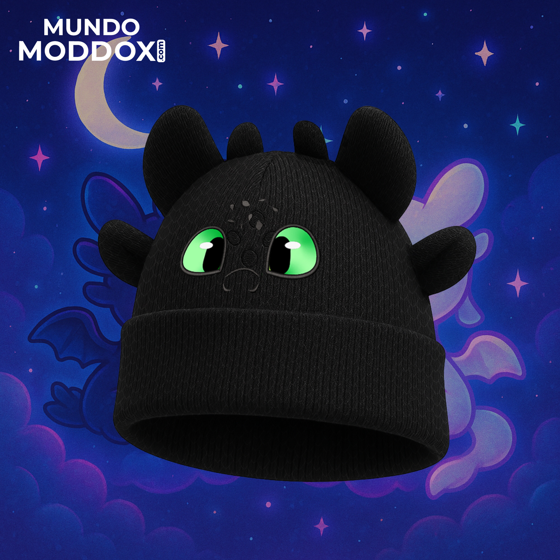 Un toque épico para tu invierno: gorro negro de punto con doblez que luce un bordado detallado de Chimuelo, orejitas y pequeños cuernos en relieve. Su tejido elástico y suave se adapta a tu cabeza, manteniéndote abrigado y con estilo dragón. 🖤🐉❄️
