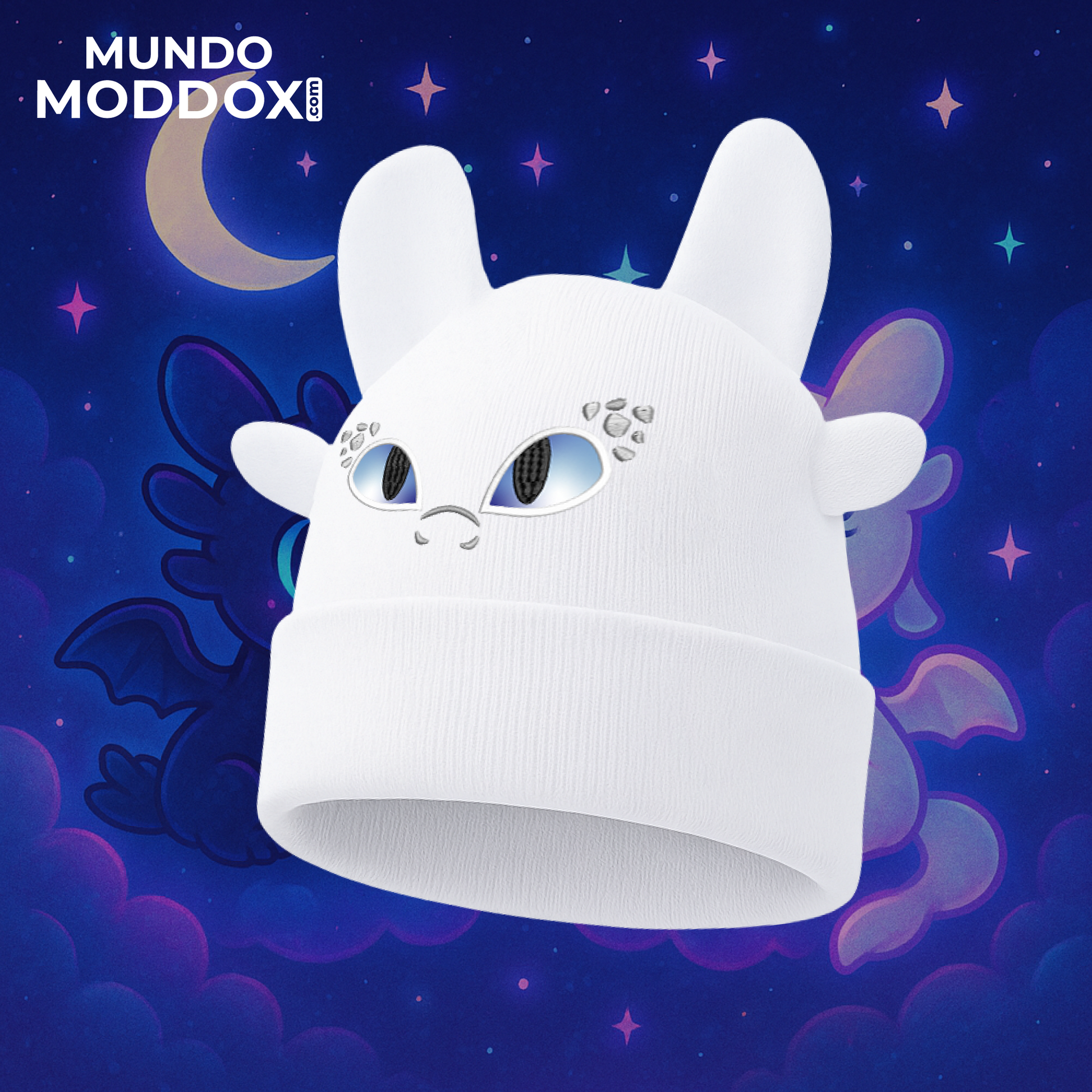 Ilumina tu look con este gorro blanco de punto: doblez con bordado de la Furia Luminosa, cuernos y orejitas en relieve. Su tejido suave y elástico te brinda confort y abrigo, ideal para cualquier aventura bajo la luna. ❄️🌙✨