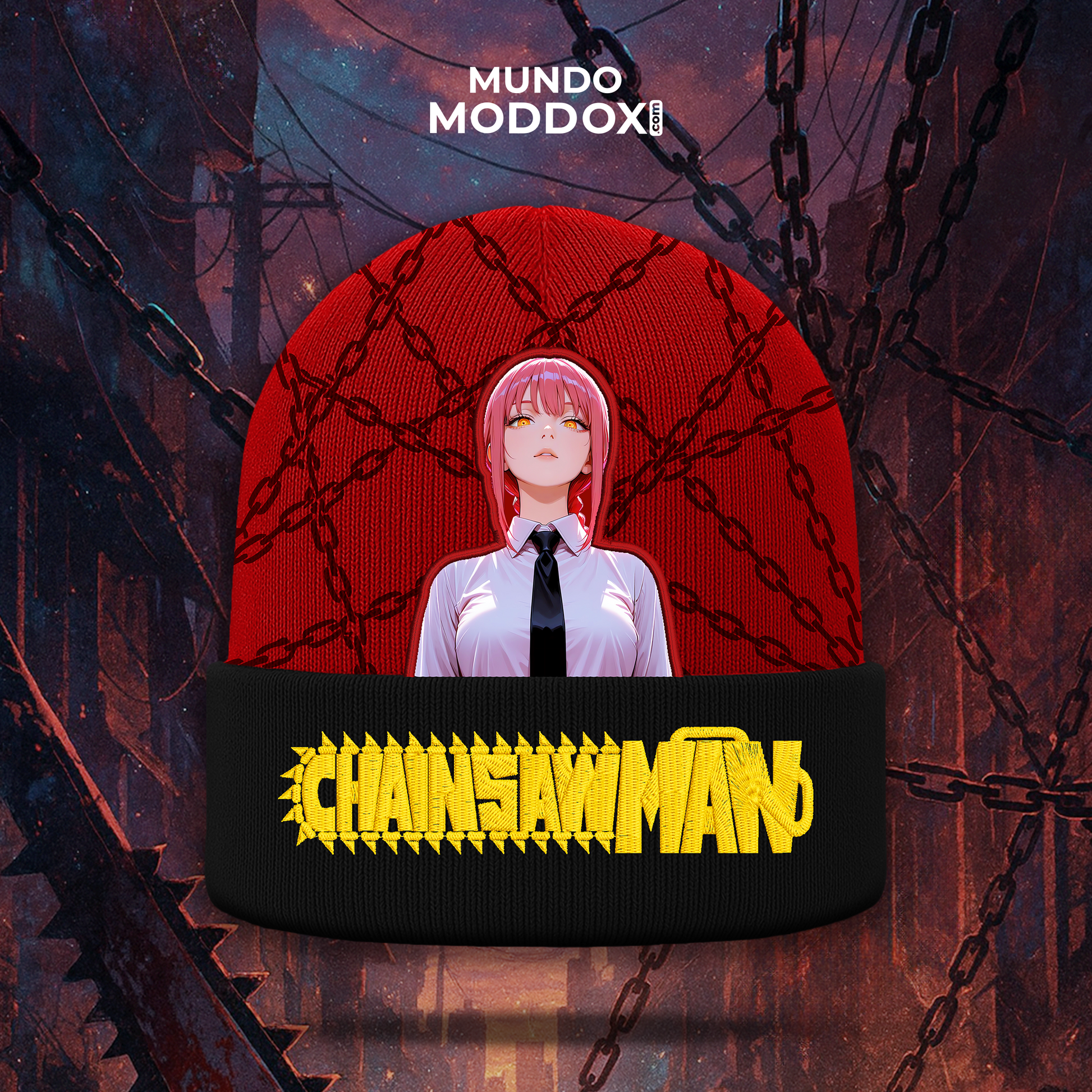 Makima al centro, fondo de cadenas y dobladillo negro con logo amarillo. Elegancia peligrosa, tacto suave y presencia hipnótica en cámara. Perfecto para citas geek y street nocturno. 💛🧵🌫️