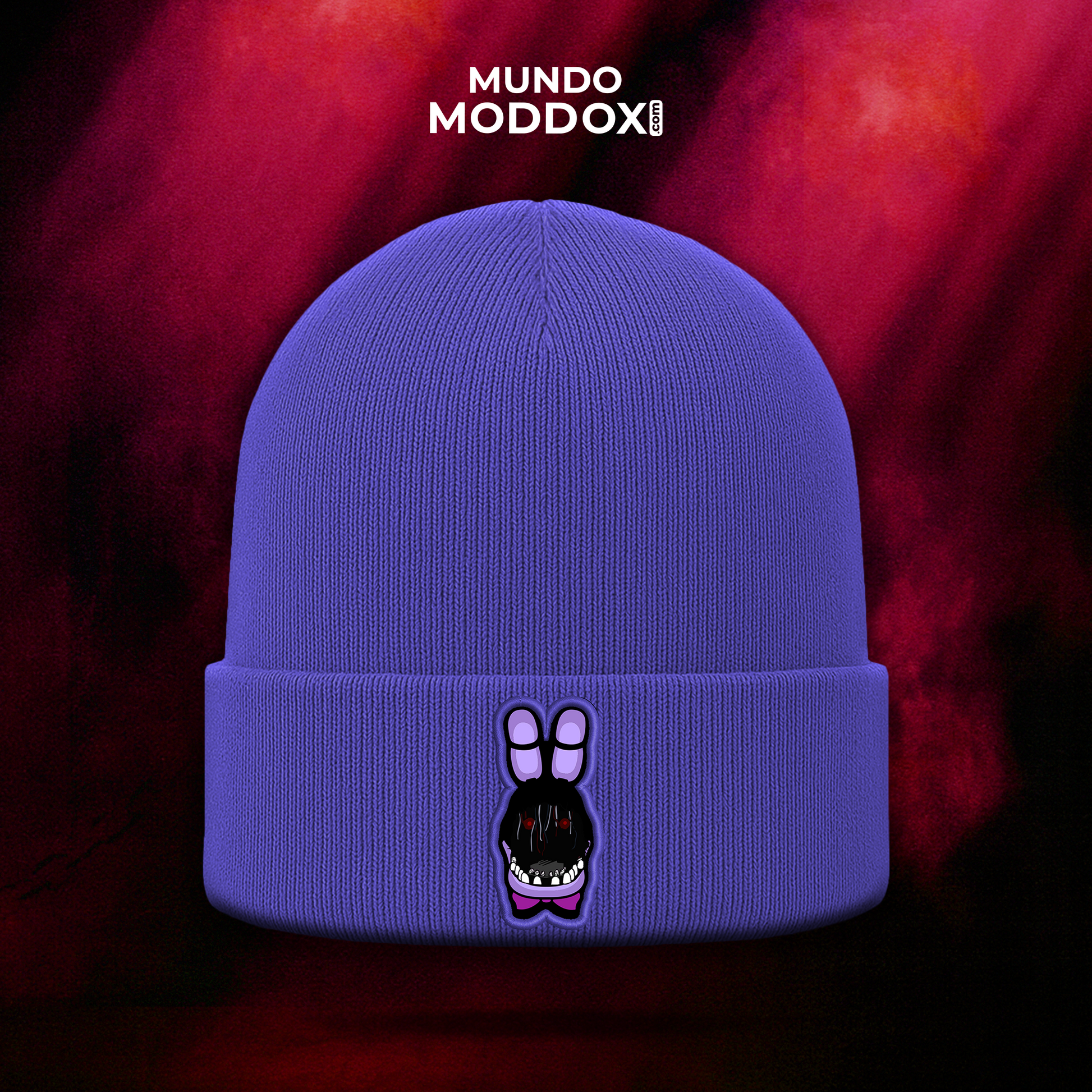 Este gorro morado lleva un mini parche de Withered Bonnie: rostro oscuro, cables y sonrisa rota 💜⚡ Perfecto para fans que quieren algo discreto pero claramente perturbador en su outfit diario.