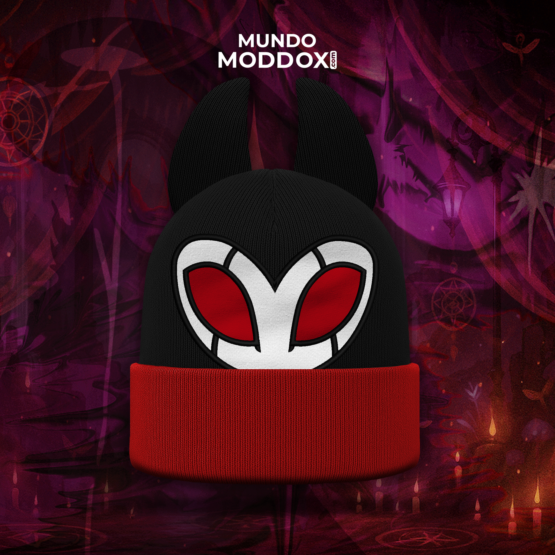 Gorro Grimm de Hollow Knight 🦇 bordado premium, puño rojo y orejitas 3D. Calidez gamer y estilo oscuro. 🔥