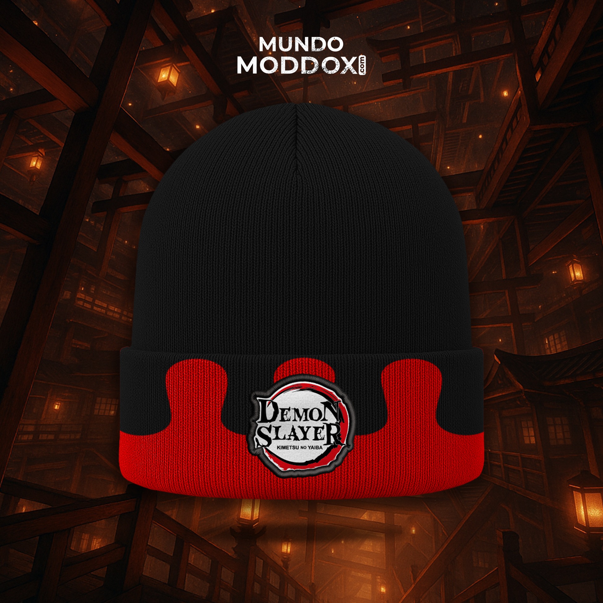 Despierta el aura implacable de la Luna Superior Dos ❄️👹. Beanie tejido en lana negro con rojo, con diseño minimalista de ondas inspirado en Doma de Kimetsu no Yaiba. Unisex, abrigador y cómodo, ideal para climas fríos ❄️ y para quienes buscan un accesorio anime oscuro y llamativo.