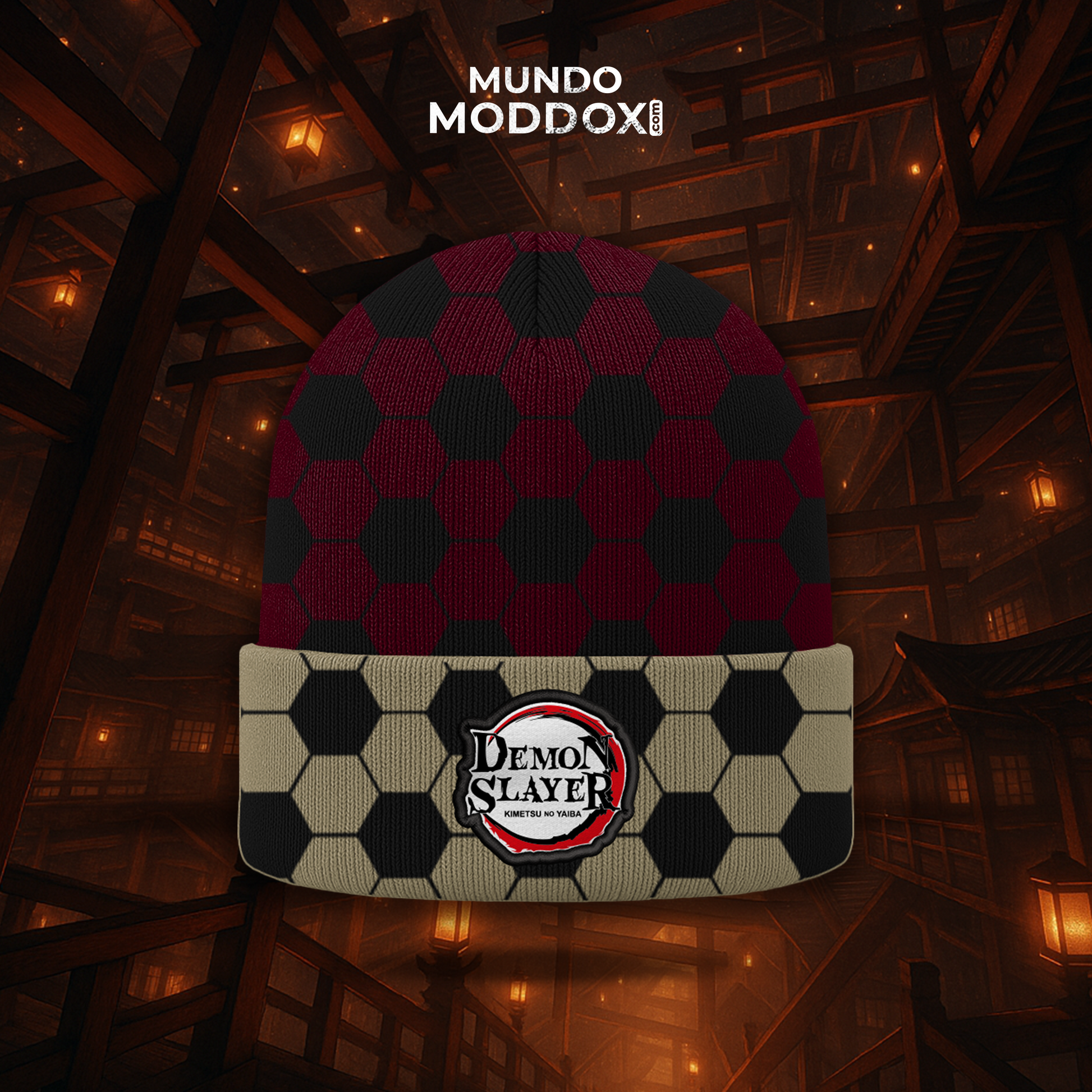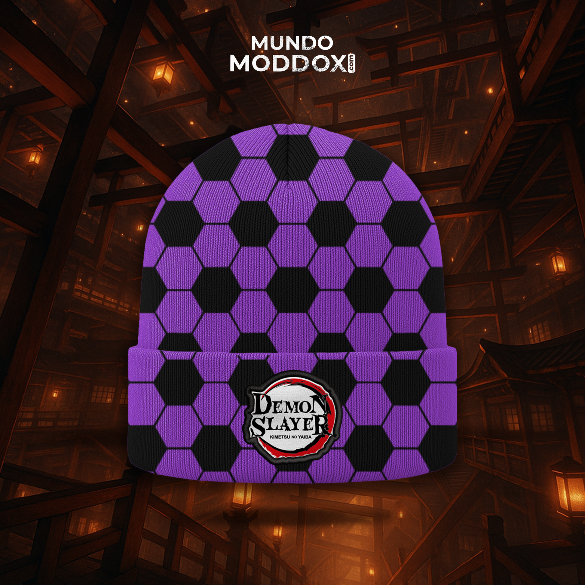 Siente el poder de la Luna Superior Uno 🌙👁️. Beanie tejido en lana con diseño hexagonal y ojos bordados, inspirado en Kokushibo de Kimetsu no Yaiba. Disponible en variantes púrpura y negro, unisex, abrigador y con detalles únicos para destacar en cualquier outfit anime. ❄️✨