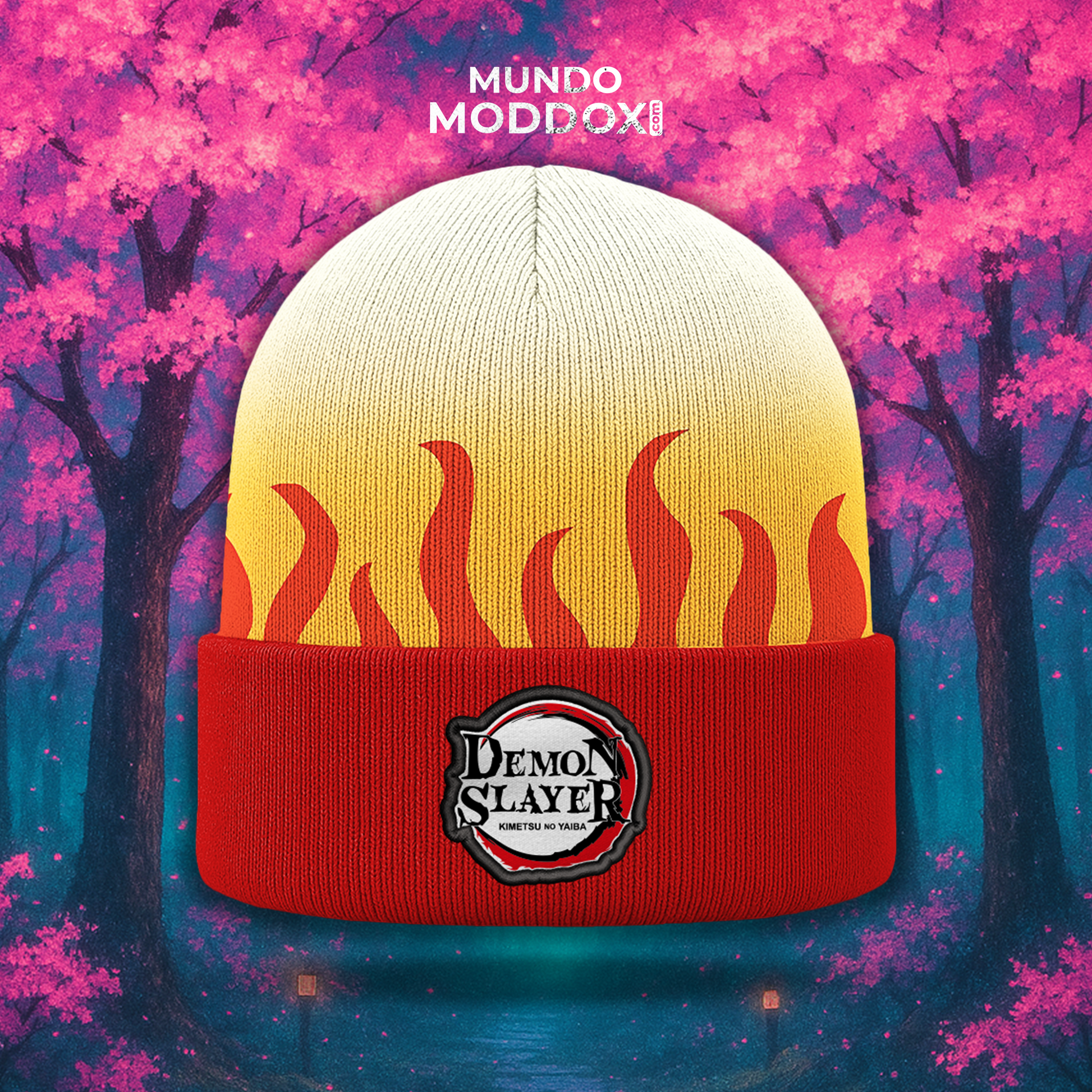 Enciende tu espíritu con el Pilar de la Llama 🔥✨. Beanie tejido en lana con diseño degradado en blanco y amarillo con llamas rojas, inspirado en Kyojuro Rengoku de Kimetsu no Yaiba. Unisex, cómodo y abrigador, ideal para climas fríos ❄️ y para destacar con un look ardiente lleno de energía.