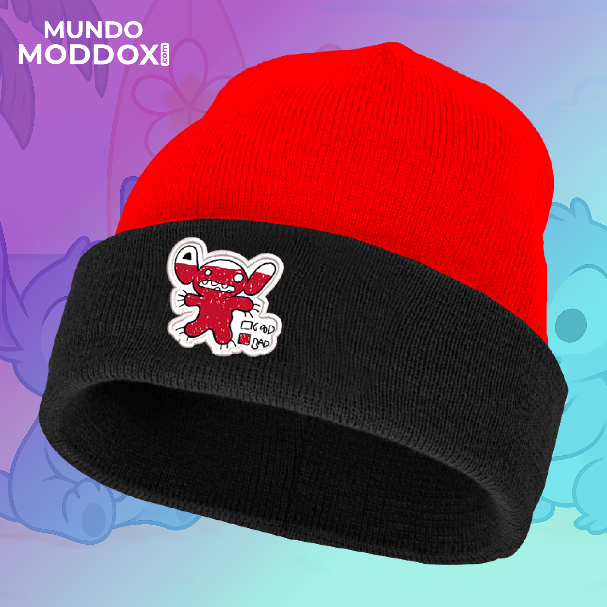 🔥 Mitad ángel, mitad travesura. Gorro bicolor rojo-negro con Leroy marcando la casilla “Bad”. Acrílico elástico, doblez cómodo y actitud 100 % rebelde para días fríos o noches gamer. 😈🧢