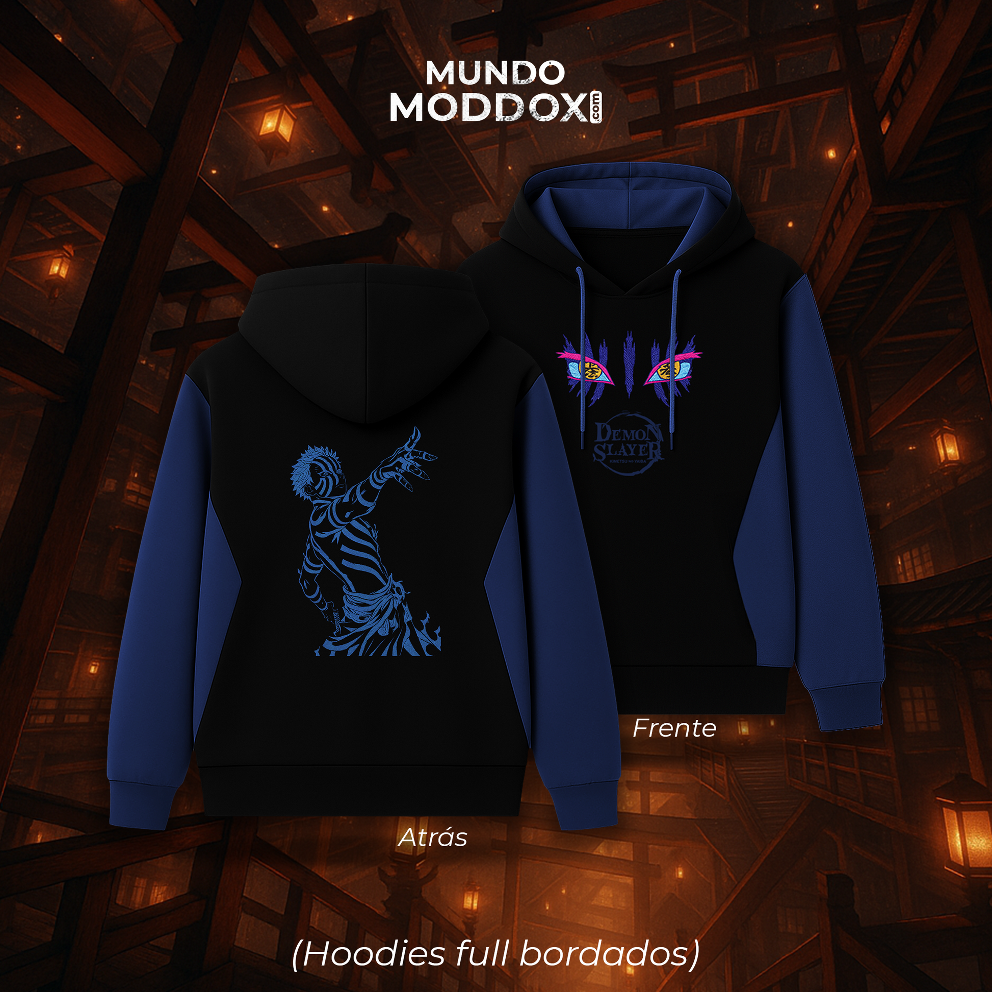 El arte de la batalla plasmado en bordado 🌀. Hoodie exclusivo con diseño frontal de los ojos de Akaza y en la espalda su silueta lista para pelear. Tela de algodón suave, capucha ajustable y acabados resistentes. Una pieza digna de todo fan de Kimetsu no Yaiba.
