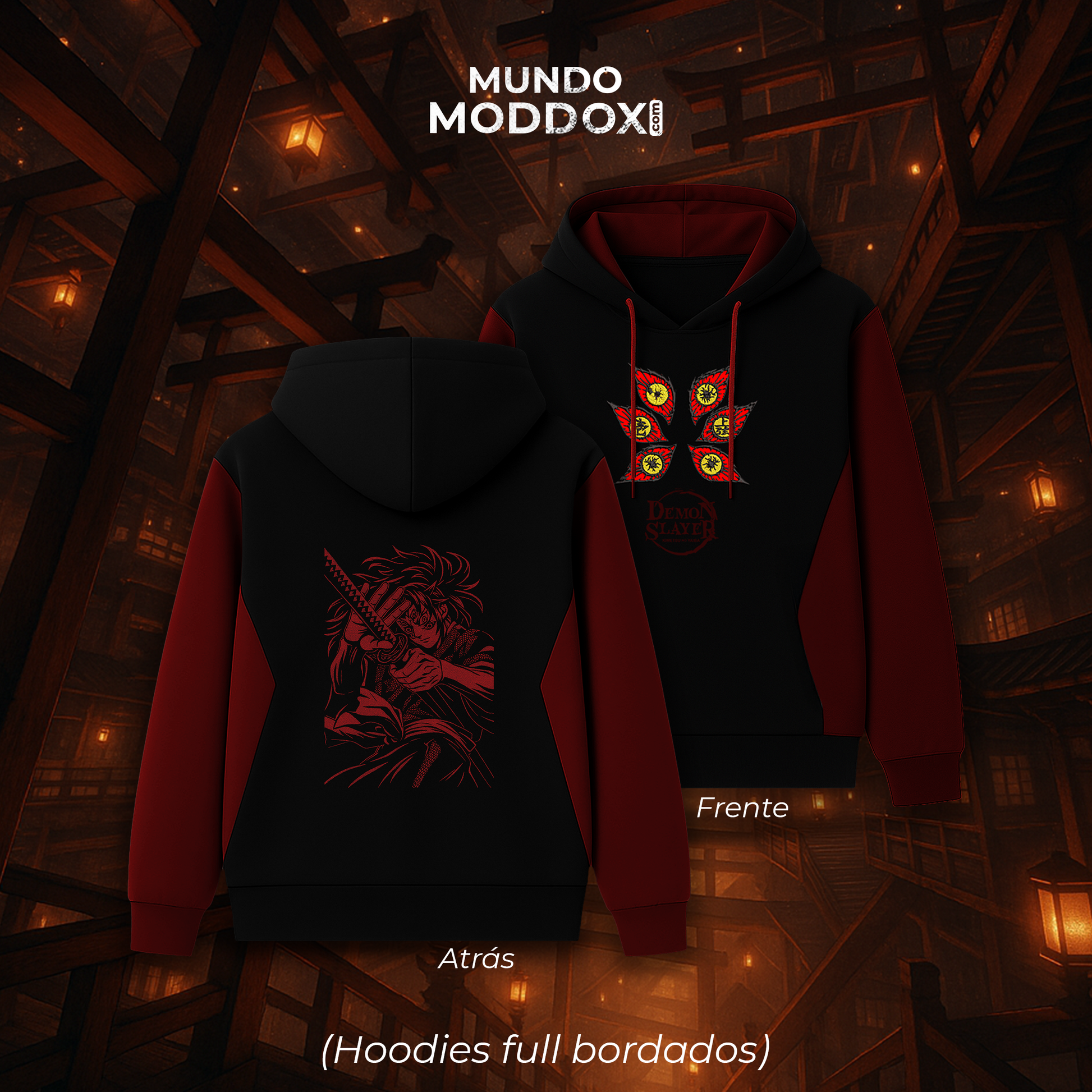 Oscuridad y poder en cada detalle 🌑. Hoodie full bordado con diseño frontal de los icónicos ojos de Kokushibo y en la espalda su imponente silueta con katana. Elaborado en algodón premium, con capucha y bolsillos amplios. Una prenda que lleva el sello de Kimetsu no Yaiba.