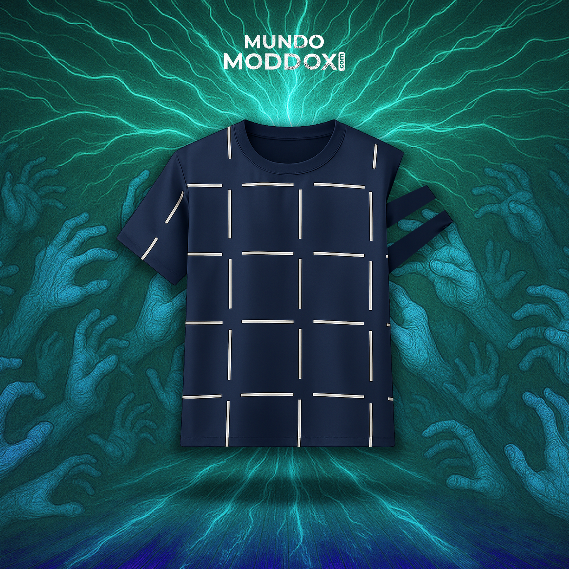 Azul marino con líneas cuadriculadas y doble cinta lateral. Minimal y sutil, inspirada en las barreras jujutsu. Tela de poliester Kiana unisex para combinar sin esfuerzo. 🟦🧵✨