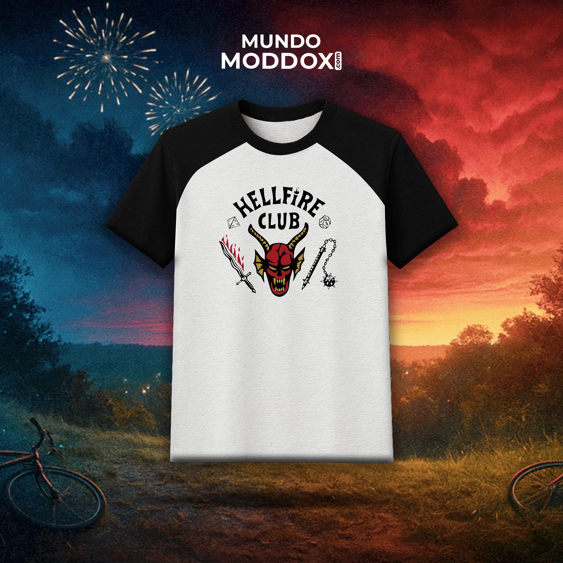 Playera raglán Hellfire Club, ligera y lista para el verano en Hawkins. Demonio, espada y cadena al frente para que se note quién manda en la mesa de juego. 🔥🎲🤘